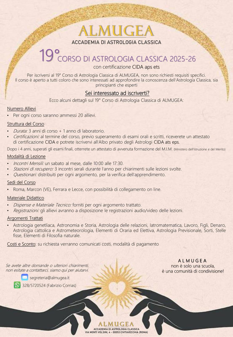 Corso triennale (cui si aggiunge un anno di laboratorio) di Astrologia Classica riconosciuto e certificato dal CIDA e proposto dall'Accademia di Astrologia Classica